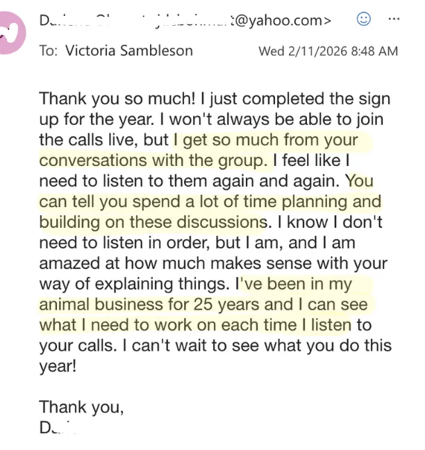 I get it. You've got a busy life. So many of my founding members thought that too. "I'll just watch when I can. I'll catch the replay." And now they're carving out time to come live. Waking up early, staying up late, because of the huge transformations people are having not only for their animals but for their personal lives too.